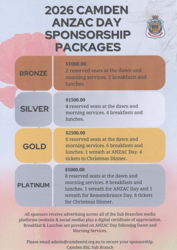 - 2 breakfasts and lunches at Camden RSL on ANZAC Day.